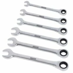 Jeu de 6 clés mixtes (clés à cliquet et clé plates). Chaque clé se compose d’une clé à cliquet et d’une clé plate de la même taille. Les clés sont forgées en chrome vanadium de haute qualité.