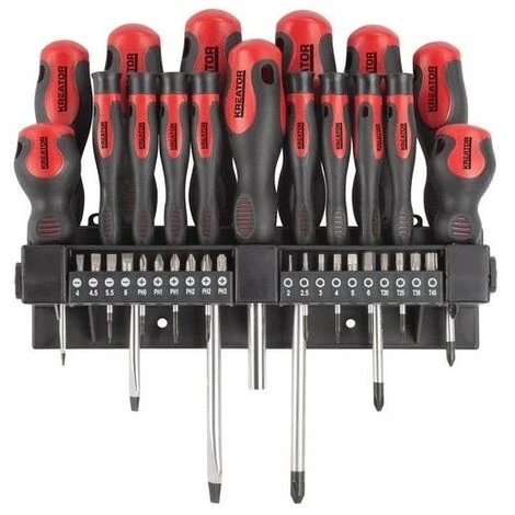 Ce jeu de tournevis et embouts de 37 pièces Kreator constitue un support mural pratique en plus de contenir divers tournevis et embouts de tournevis. Il peut être fixé avec quelques vis. Cela permet de conserver tous vos outils de visserie bien rangés et à portée de main.