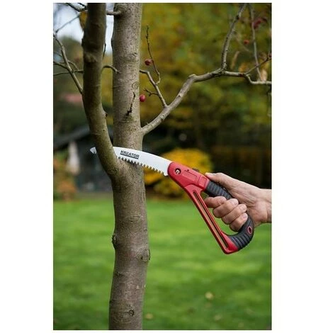 Sa lame est fabriquée en acier inoxydable et revêtue d’un chromage dur qui garantit une force et une durabilité supplémentaires. Chaque dent est affutée sur trois côtés et encore durcie pour un résultat de sciage extrêmement net et puissant. La poignée antidérapante permet une prise en main correcte et ferme. La poignée est entièrement fermée et protège ainsi parfaitement vos mains durant l’élagage et le sciage.