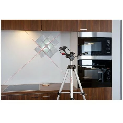 C’est aussi possible de projeter la croix et la ligne laser à 90° ensemble. L’appareil a une fonction de verrouillage ce qui assure que les lignes demeurent perpendiculaires, également en changeant de direction. Le laser commencera à clignoter si vous ne travaillez plus de niveau. Ainsi vous êtes toujours sûr de mesurages corrects. Le KRT706310 se règle lui-même automatiquement en six secondes, avec une précision de 0,6 mm/mètre. Vous placez le laser encore plus stable sur un trépied, tel que le KRT706900.