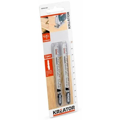 Informations produit: Lame de scie pour bois dur Marque Kreator Lot de 2 lames Adaptable sur la majorité des scies sauteuses deu marché Longueur: 100 mm Nombre de dents: 6 TPI T-shank